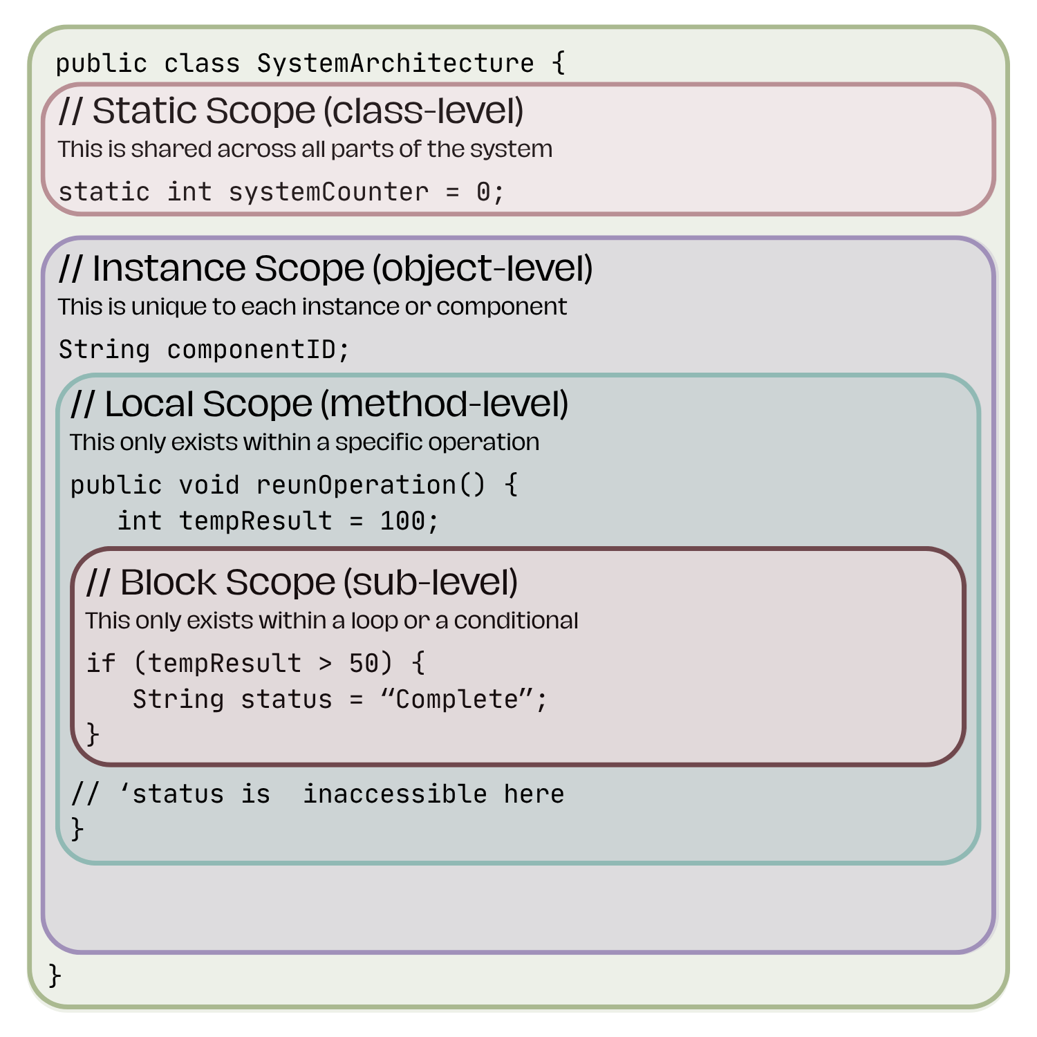 public void calculateSum() { int num1 = 10; // num1 is local to calculateSum int num2 = 20; // num2 is local to calculateSum int sum = num1 + num2; // sum is local to calculateSum System.out.println(sum); if (sum > 0) { String message = "Positive sum"; // message is local to this if-block System.out.println(message); } // System.out.println(message); // ERROR! message is not accessible here. } // System.out.println(num1); // ERROR! num1 is not accessible here.